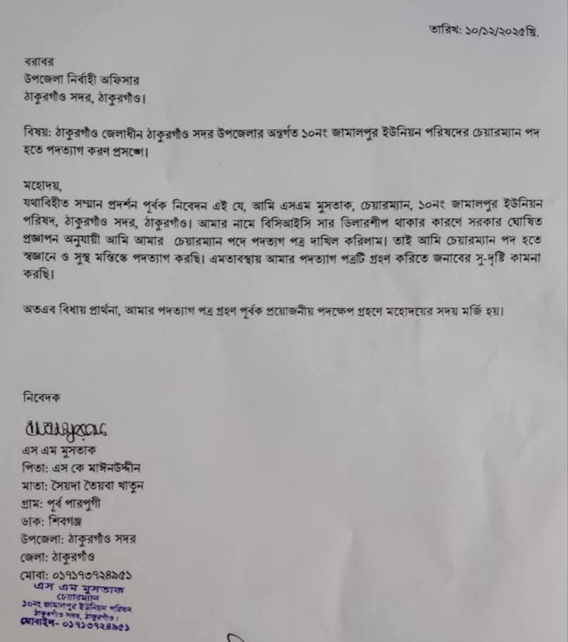 রাণীশংকৈলের পর এবার ঠাকুরগাঁও সদরের ১০ নং জামালপুর ইউনিয়ন পরিষদের চেয়ারম্যান এসএম মুসতাক স্বীয় পদ থেকে পদত্যাগ করেছেন।বুধবার (১০ ডিসেম্বর) তিনি ঠাকুরগাঁও সদর উপজেলা নির্বাহী অফিসার খায়রুল ইসলামের নিকট লিখিত পদত্যাগ পত্র জমা দেন।