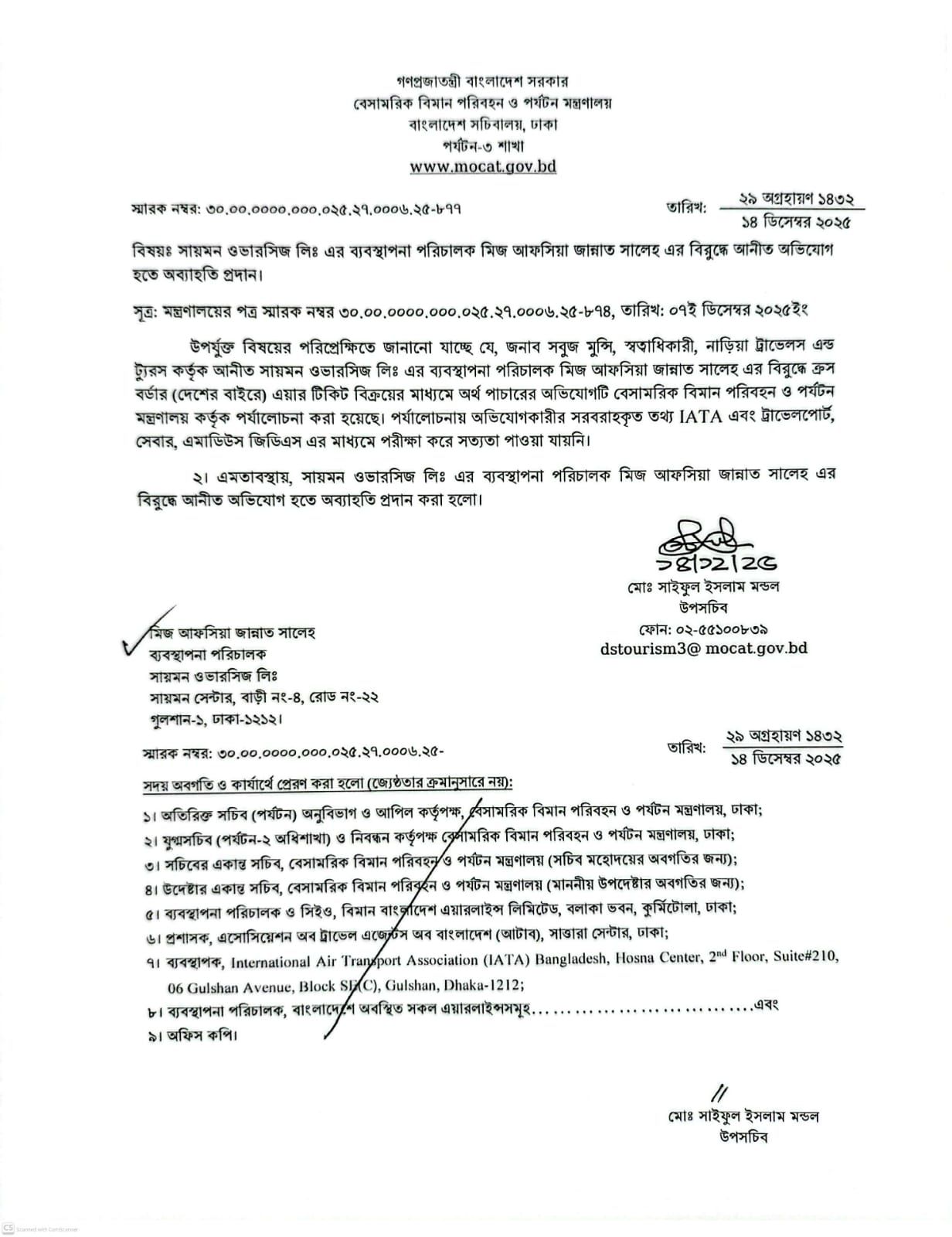 মন্ত্রণালয় সূত্রে জানা গেছে, সব দিক বিবেচনা করে অভিযোগটিকে মিথ্যা হিসেবে চিহ্নিত করে সাইমন ওভারসিজ লিমিটেডকে অব্যাহতি প্রদান করা হয়েছে (বিমান মন্ত্রনালয় পত্র নং ৩০.০০.০০০০. ০০০. ০২৫.২৭.০০০৬.২৫-৮৭৭ তারিখ ১৪ই ডিসেম্বর ২০২৫ইং)।