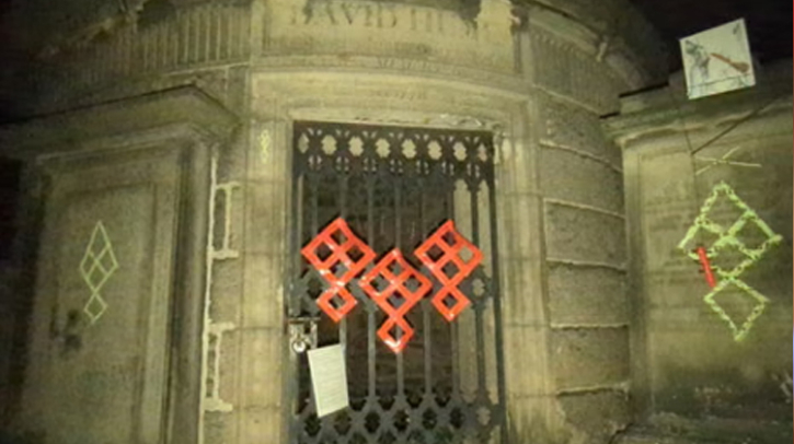A tour guide discovered the vandalism, which reportedly included graphic drawings, coded tape and ritual-like objects attached to Hume’s mausoleum and nearby memorial stones.